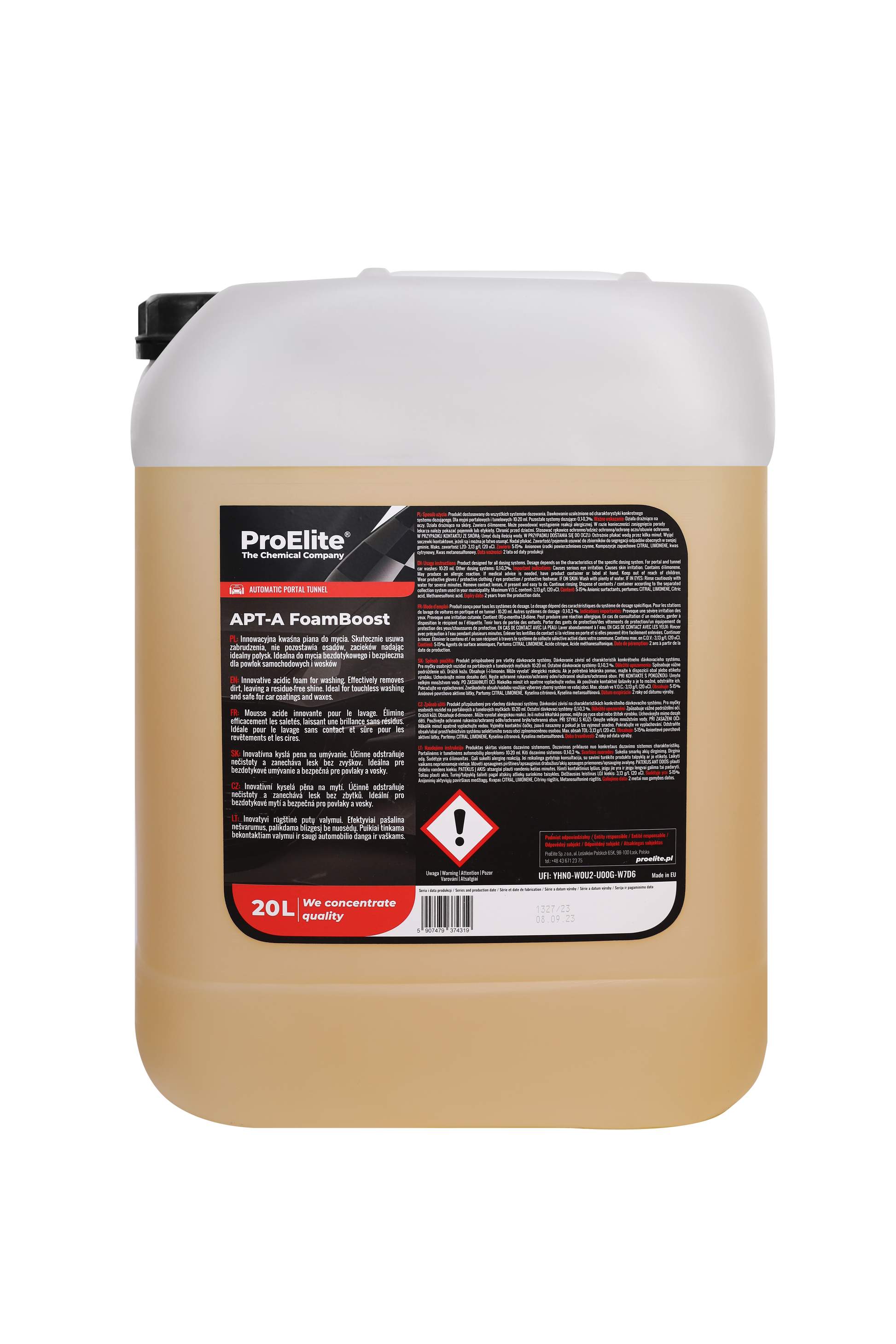 APT-A FoamBoost – Fortschrittlicher Reinigungsschaum mit saurem pH-Wert. APT-A FoamBoost ist ein neuartiger Schaum, der für die gründliche Reinigung von Fahrzeugen konzipiert wurde. Er entfernt zuverlässig alle Arten von Schmutz, hinterlässt keine Streifen oder Rückstände und sorgt für einen makellosen Glanz auf der Oberfläche. Ideal für die berührungslose Waschmethode, ist er zudem sicher für alle Beschichtungen und Wachsschichten des Fahrzeugs. Die innovative Formel von APT-A FoamBoost ermöglicht eine verbesserte Schäumung, die das Entfernen von Schmutz und Ablagerungen auf Fahrzeugoberflächen erheblich erleichtert. Dank der konzentrierten Zusammensetzung ist das Produkt äußerst effizient und sparsam in der Anwendung, was zu einem effektiveren Waschprozess und hervorragenden Ergebnissen führt. APT-A FoamBoost ist die ideale Wahl für professionelle Anwendungen, die höchste Ansprüche an Reinigung und Pflege stellen.