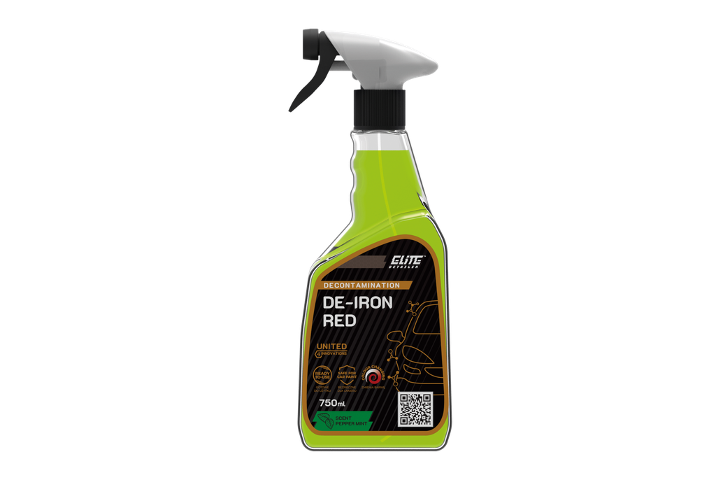 DE-IRON RED ist ein hochtechnologisches, pH-neutrales Gel zur Entfernung von metallischen Verunreinigungen und Flugrost. Es erzeugt den „blutenden Felgen“-Effekt, wenn es mit metallischem Schmutz reagiert, und färbt sich rot. Sicher für alle Oberflächen wie Autolack, Glas und Kunststoff. Die hohe Viskosität sorgt für eine lange Verweilzeit auf der Oberfläche.