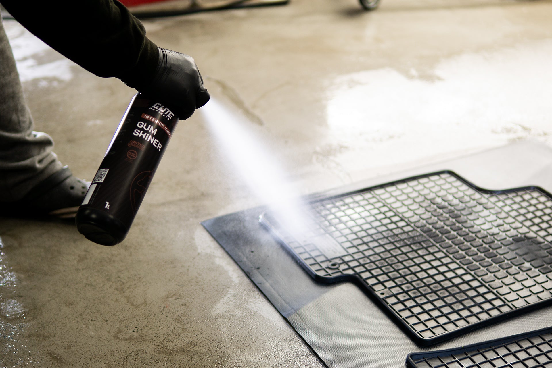 - Das Produkt mit einer Sprühflasche gleichmäßig auf die saubere und trockene Gummimatte auftragen.